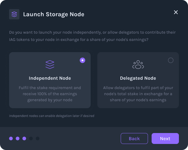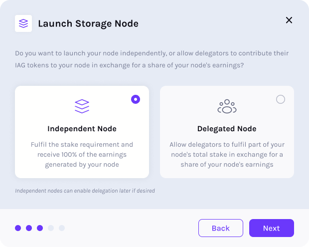 - You will need to decide if you want to run this node as an independent node or a delegated node. An independent node will be staked only by you, and you will keep all of the node’s earnings. A delegated node will be staked partially by you (at least the minimum requirement) and partially by other IAG token holders, with whom you will share the node’s earnings with. If you have any questions about these differences, please reach out to our team or refer to the Staking Platform documentation
